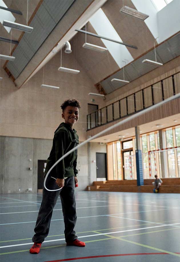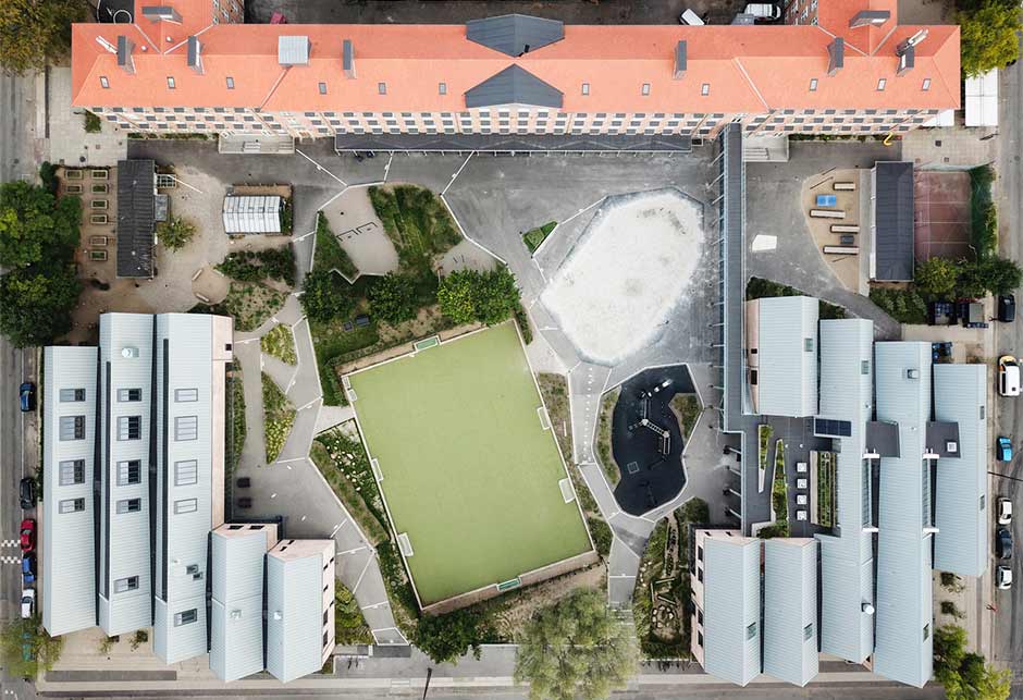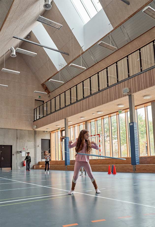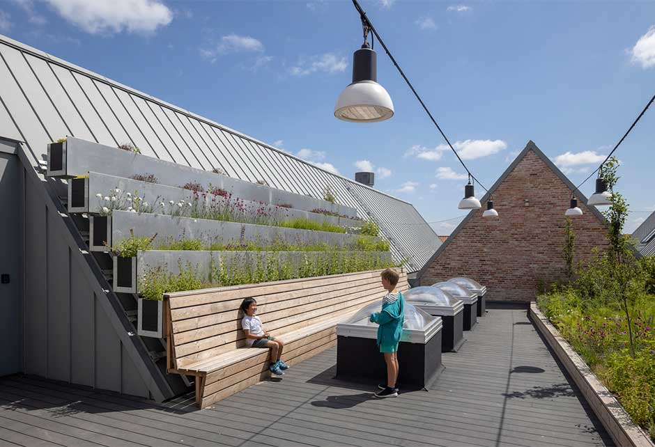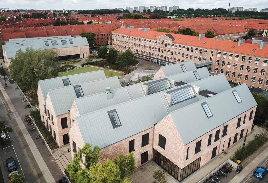 À Copenhague, l'école Grøndalsvængets, quasi-centenaire, a fait l'objet d'une rénovation et d'une extension, le but étant de créer plus d'espace pour le sport, la musique et l'apprentissage. Ce projet durable a inclus la réutilisation du bâtiment principal existant, ainsi que deux nouvelles constructions. Ces bâtiments ont été conçus pour transformer les salles de classe, avec l'ajout de verrières modulaires pour optimiser la lumière naturelle et l'air frais, et dynamiser les élèves.