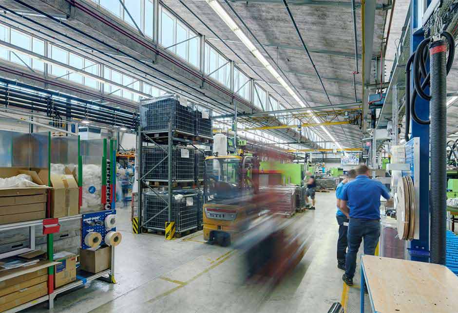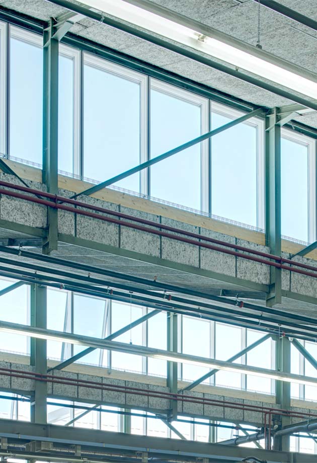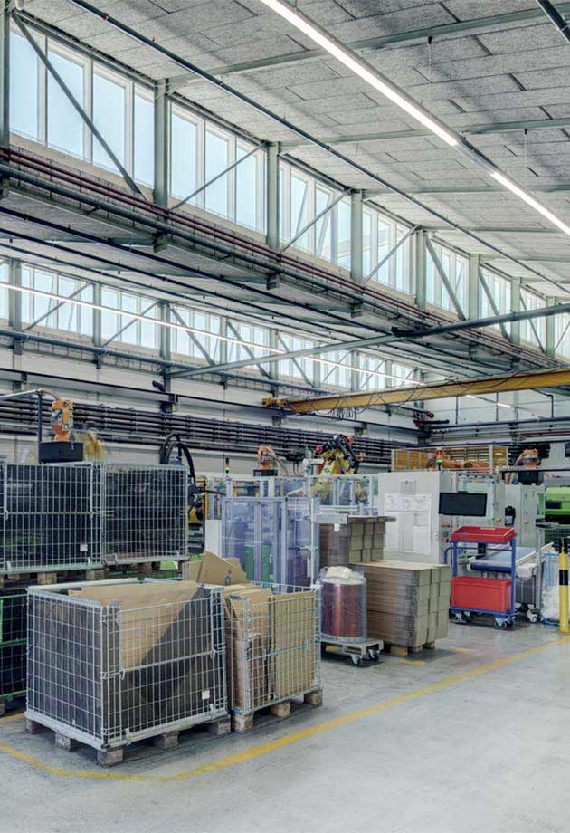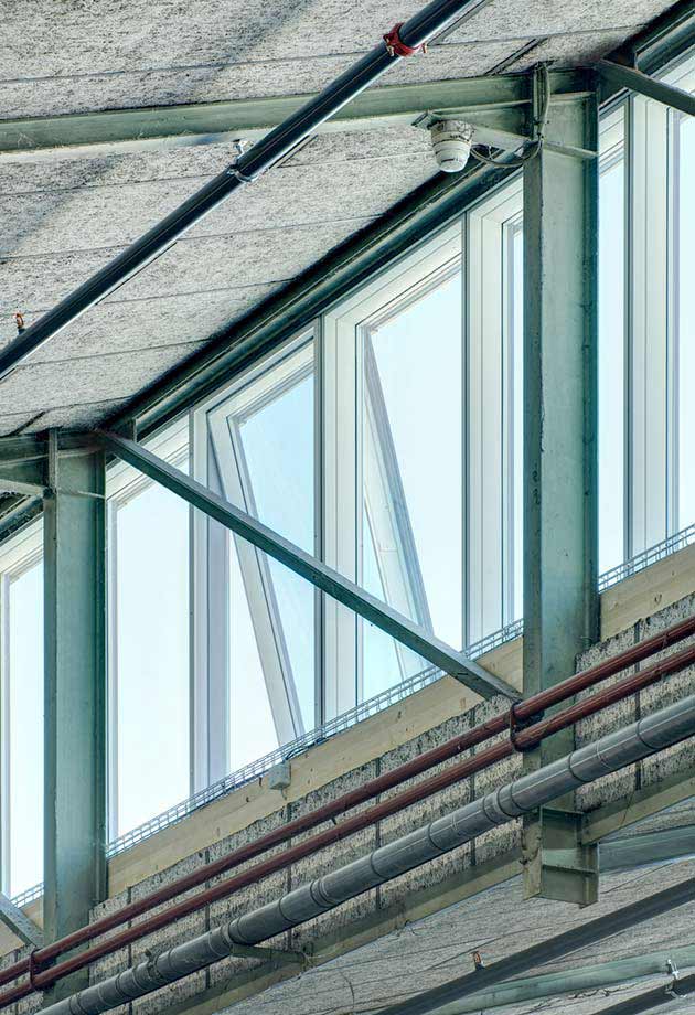 L’activité de production industrielle a continué sans interruption durant les six mois nécessaires à la rénovation du toit, d’octobre 2019 à mars 2020. Pour protéger le personnel ainsi que les fragiles robots de production, un filet de sécurité a été tendu afin de permettre le déroulement simultané des opérations de production à l’intérieur du bâtiment et des travaux sur le toit. Ainsi, la rénovation, faite en site occupé, s’est déroulée rapidement et en toute sécurité, chaque ancienne fenêtre étant remplacée le même jour par un nouveau module de verrière.