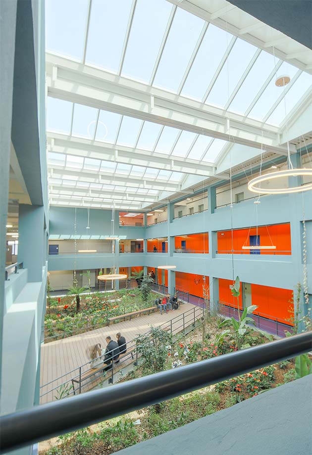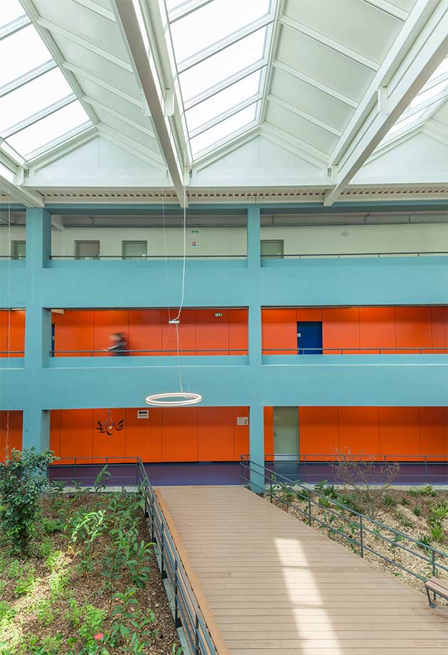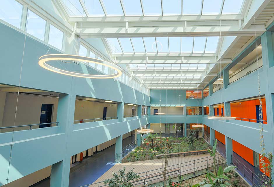 Pour se rendre à leurs salles de classe, les occupants du lycée Renoir devaient auparavant passer par un atrium sombre bien que doté d’un éclairage artificiel. La rénovation de cet espace central de circulation offre désormais à chacun une vue imprenable sur le ciel, un éclairage naturel permanent et un climat intérieur sain.