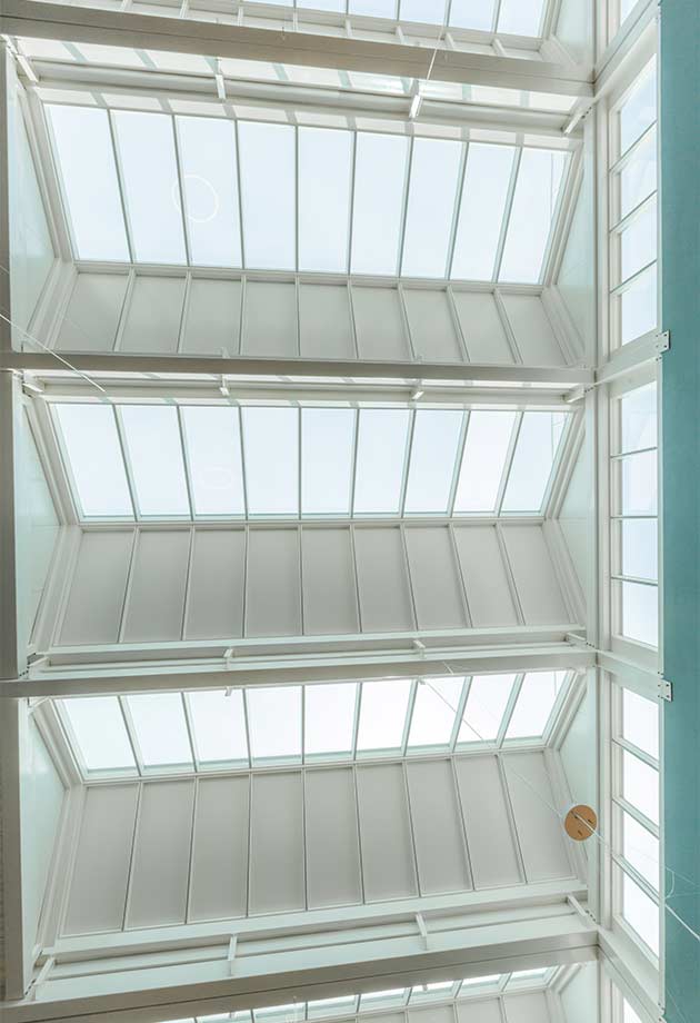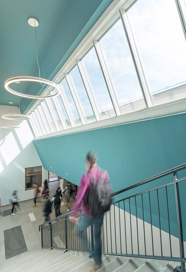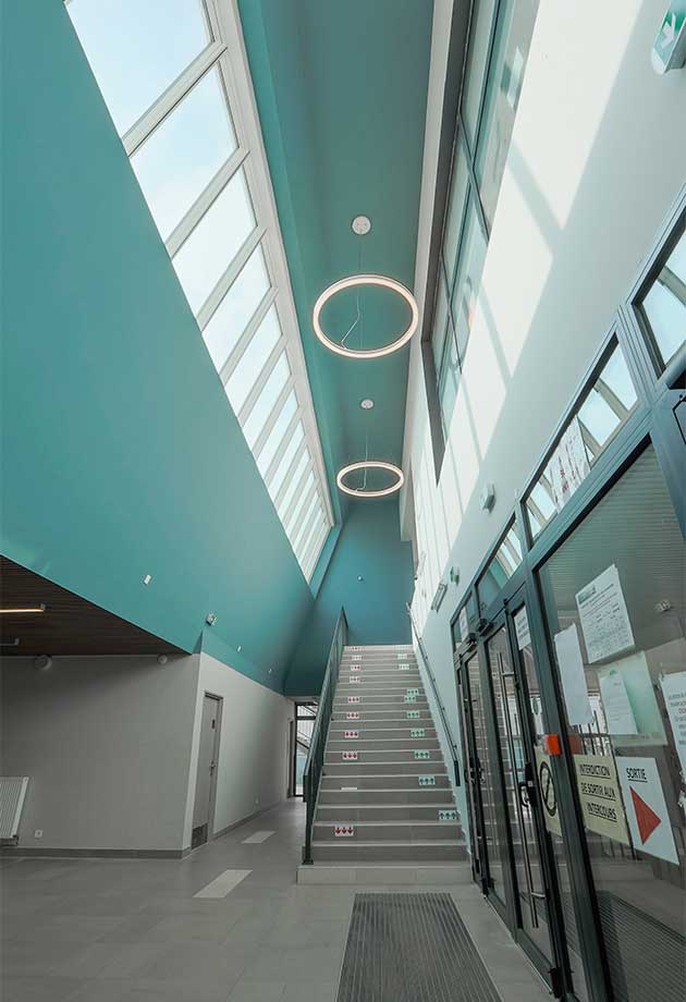 Enfin l’esthétique de la solution (profilés fins, moteurs des modules ouvrants invisibles) ont convaincu l’architecte d’ajouter à également une verrière en shed au-dessus des escaliers du lycée.