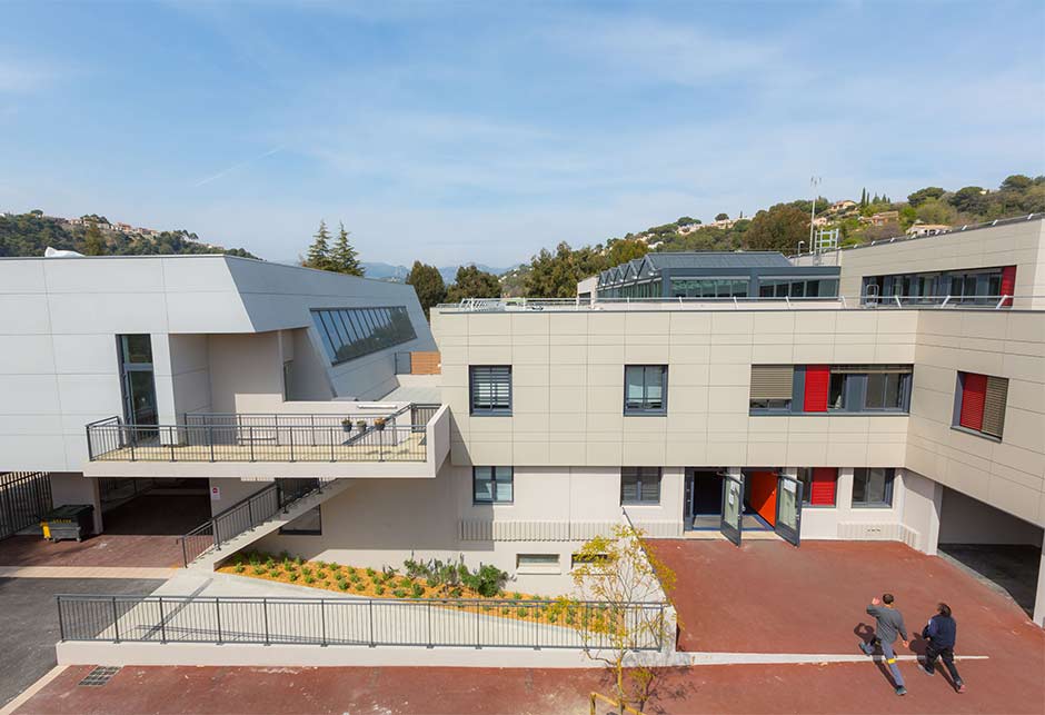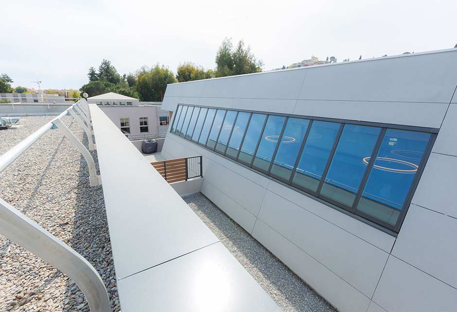 Afin d’obtenir une verrière de type shed, VELUX a proposé que le pan le plus court de la verrière double, orienté Sud, soit constitué de panneaux pleins isolants. L’entrée de lumière naturelle dans le bâtiment se fait donc par le pan orienté au Nord, ce qui est particulièrement appréciable dans ce lycée du Sud de la France afin d’obtenir une lumière plus douce et diffuse et limiter l’entrée de chaleur.