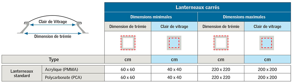 Lanterneaux carrés Dimensions disponibles pour les coupoles carrées. Aperçu général - voir la brochure produits pour des informations détaillées. Autres dimensions sur demande.